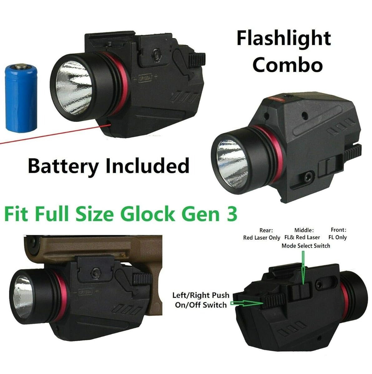 Tactical Flashlight Laser Combo – 200 Lumen LED + Class IIIA Red Laser – Picatinny Mount – Fits Glock Gen 3