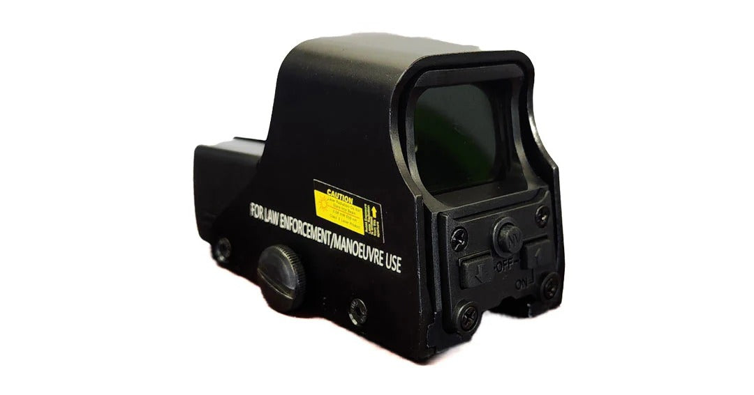 Durable metal holographic sight with dual-color reticle and adjustable brightness. Designed for fast target acquisition with unlimited eye relief. Fits 20 mm Weaver/Picatinny rails, making it suitable for tactical training, airsoft, and recreational shooting setups. Includes batteries, cloth, and manual for immediate use out of the box.